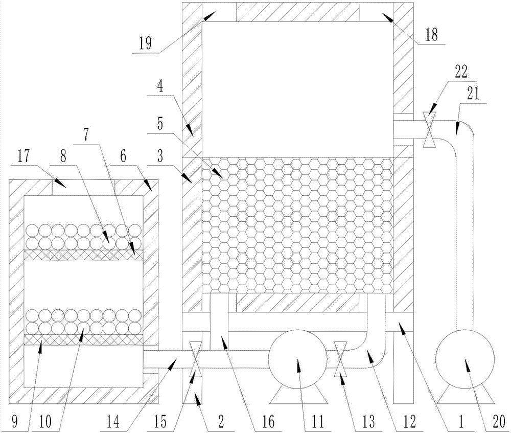 在本實(shí)施方案中,在設(shè)備空閑處設(shè)有HB104控制器,控制器的輸出端與一號(hào)電磁閥13、二號(hào)電磁閥15、三號(hào)電磁閥22、一號(hào)引風(fēng)機(jī)11、二號(hào)引風(fēng)機(jī)20的輸入端均通過(guò)導(dǎo)線相連接,將設(shè)備連接電源,通過(guò)控制控制器控制二號(hào)電磁閥15、一號(hào)引風(fēng)機(jī)11打開,一號(hào)電磁閥13、三號(hào)電磁閥22、二號(hào)引風(fēng)機(jī)20關(guān)閉,從廢氣廢氣進(jìn)氣口17進(jìn)入矩形箱體6,經(jīng)過(guò)一號(hào)網(wǎng)格擋板7上的脫氮?jiǎng)?祛除廢氣中的氮,經(jīng)過(guò)二號(hào)網(wǎng)格擋板9上的脫硫劑10祛除廢氣中的硫;脫硫劑10、脫氮?jiǎng)?能夠與化肥廠合作提取合成化肥,利用率提高;在一號(hào)引風(fēng)機(jī)11的作用下通過(guò)二號(hào)管道14、三號(hào)管道16進(jìn)入U(xiǎn)形槽3,經(jīng)過(guò)陶瓷蓄熱體5進(jìn)入到倒U形槽4,倒U形槽4內(nèi)通過(guò)燃料入口18加入燃料,通過(guò)進(jìn)風(fēng)口19加入氧氣,將廢氣加熱到700-900攝氏度使廢氣中的VOC在氧化分解成二氧化碳和水,氧化產(chǎn)生的高溫氣體流經(jīng)特制的陶瓷蓄熱體5,使陶瓷蓄熱體5升溫而“蓄熱”,此“蓄熱”用于預(yù)熱后續(xù)進(jìn)入的有機(jī)廢氣,從而節(jié)省廢氣升溫的燃料消耗,可以控制三號(hào)電磁閥22、二號(hào)引風(fēng)機(jī)20的開關(guān)控制廢氣處理時(shí)間,達(dá)到時(shí)間后打開三號(hào)電磁閥22、二號(hào)引風(fēng)機(jī)20,在二號(hào)引風(fēng)機(jī)20的作用下將處理后的廢氣排出;也可以控制一號(hào)電磁閥13、一號(hào)引風(fēng)機(jī)11打開,二號(hào)電磁閥15、三號(hào)電磁閥22關(guān)閉,將廢氣循環(huán)引入U(xiǎn)形槽3、倒U形槽4內(nèi),可循環(huán)處理,多次處理后廢氣分解效率達(dá)到99%以上,節(jié)約空間、節(jié)省投資費(fèi)用。