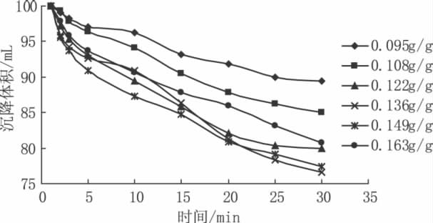 1. 2. 2 污泥沉降性能的測定量取100 mL 污泥,投入一定量的PAC,采用 1. 2. 1中的處理方法進(jìn)行制備,然后倒入100 mL 量筒中,按照污泥沉降實(shí)驗(yàn)方案中的規(guī)定,每隔幾分鐘 ( 由于污泥沉降的特性間隔時(shí)間逐漸延長) 記錄一次污泥體積,共計(jì)時(shí)30 min。在相同條件下,改變投加PAC 的量,得到一組數(shù)據(jù)以比較污泥的沉降性能。