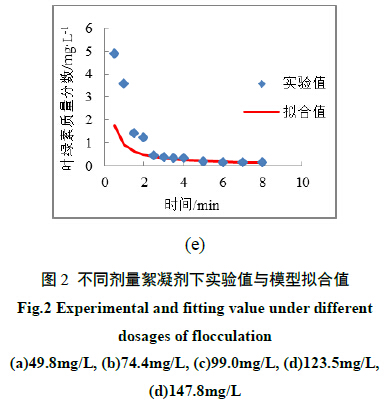 圖2表示在不同PAC劑量下實驗值和擬合值比較。從圖中可看出,采用二級動力學模型描述PAC絮凝小球藻是合適的,特別是在絮凝劑劑量小于100mg/L時,實驗實測數據與擬合曲線吻合。在PAC劑量為123.5mg/L和147.8mg/L時,絮凝時間小于2min時,實驗實測數據和擬合值有一定的偏差,這可能是在絮凝初期,礬花顆粒較小,沉降速度較慢,同時取樣位置液面下2cm處,造成實驗值偏高,當沉降時間大于2min時,礬花顆粒增大,沉降速度增大,實驗值與擬合值較為吻合。
