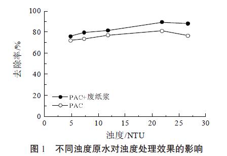 當(dāng)PAC、廢紙漿投加量分別為10、20 mg/L 時, 研究廢紙漿與PAC 配合使用對不同濁度原水的混 凝沉淀處理效果,并與單獨(dú)使用投加量10 mg/L PAC 的處理效果相比較,結(jié)果如圖1 所示。
